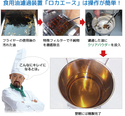 「ロカエース」と「クリアセット」を使うことにより、今まで惣菜ご担当者様が抱えていた油の問題を一気に解決します。